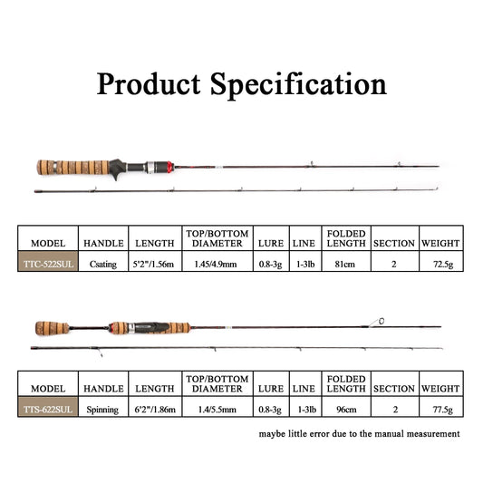 Super Ultralight 1.56m 5'2" Casting 1.86m 6'2" Spinning Soft Carbon Fishing Rod Lure Fish Cane Stick 0.8-3g